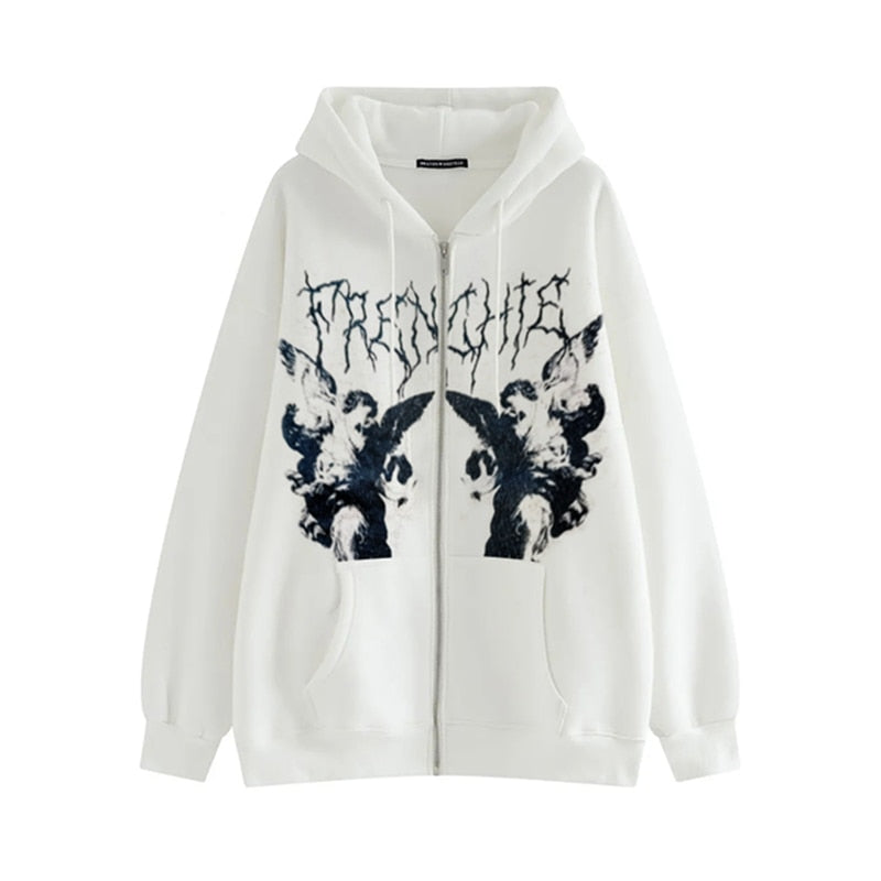 2021 Women Hip Hop Streetwear Hoodies Autumn Winter Angel Print Jacket Coat Goth Harajuku Y2K Zipper Outwear Oversized Hoodies